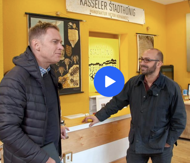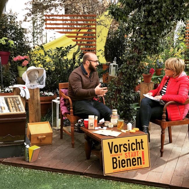 Heute bin ich mit einer kleinen Delegation an Mitarbeitern unserer Stadtimkerei im Nachmittagsformat vom hr-Fernsehen. HALLOHESSEN, 16 Uhr geht’s los. Mega Aufwand: Honig für die Kamerafrauen und Kabelträger einpacken, Bienenvolk verstauen, Klein Carlo zur Omi bringen, Hemd bügeln… Letzteres ist frei erfunden. Ich trete auf wie Ihr mich kennt: knitterig und immer etwas gaga, Imker…